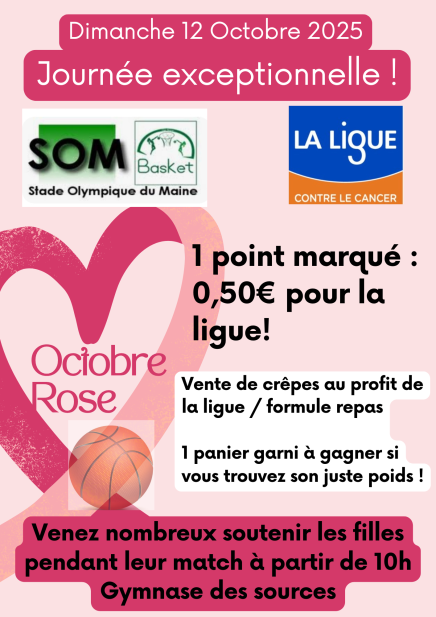 à l'occasion d'octobre rose, chaque point marqué rapportera 0,5cts pour la ligue contre le cancer. Des crêpes seront vendues et les bénéfices seront également reversés sous forme de dons.